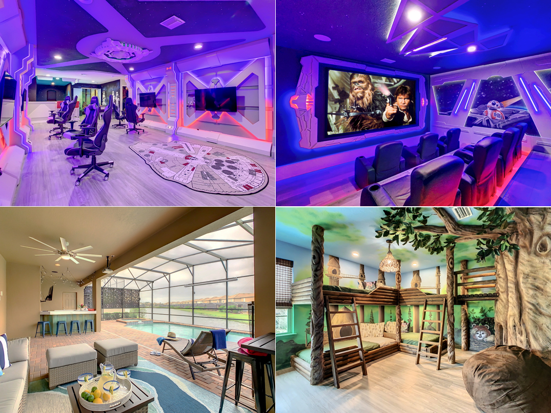 Home Highlights: Beautiful Vacation Home Loaded with Fun - 2 Movie Theaters (one inside the home and one poolside) - 3 Star Wars Theme Bedrooms - Private Heated Pool/Spa (heating extra $) - Covered Lanai with Bar and TV - 3 King Suites